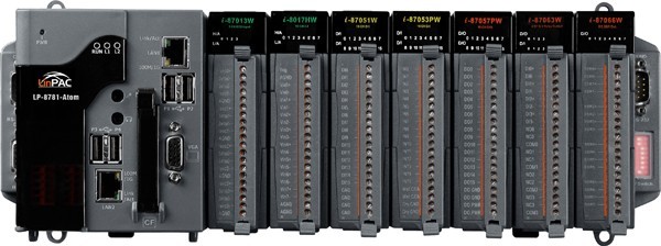 Tilslutningsmuligheder: (VGA(1024x768), 4xUSB, 2xEthernet, RS-232/485) med 1/3/7 I/O slots for parallelle I/O moduler (høj profil I-8K) og serielle I/O moduler (høj profil I-87K).