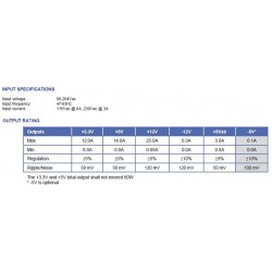 | Udgangseffekt | +3.3v: 12A; +5v: 14A; +12V: 25A; -12V: 0.3A: +5Vsb: 3A. the +3.3V and +5V max total (80W). -5V on request |