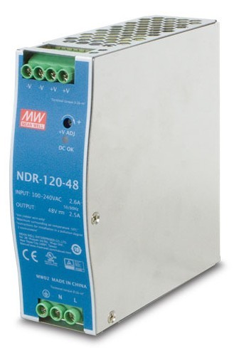 48VDC 2.5A (120Watt) strømforsyning fra 100-240VAC, justerbar fra 48 - 55VDC, DIN-skinne