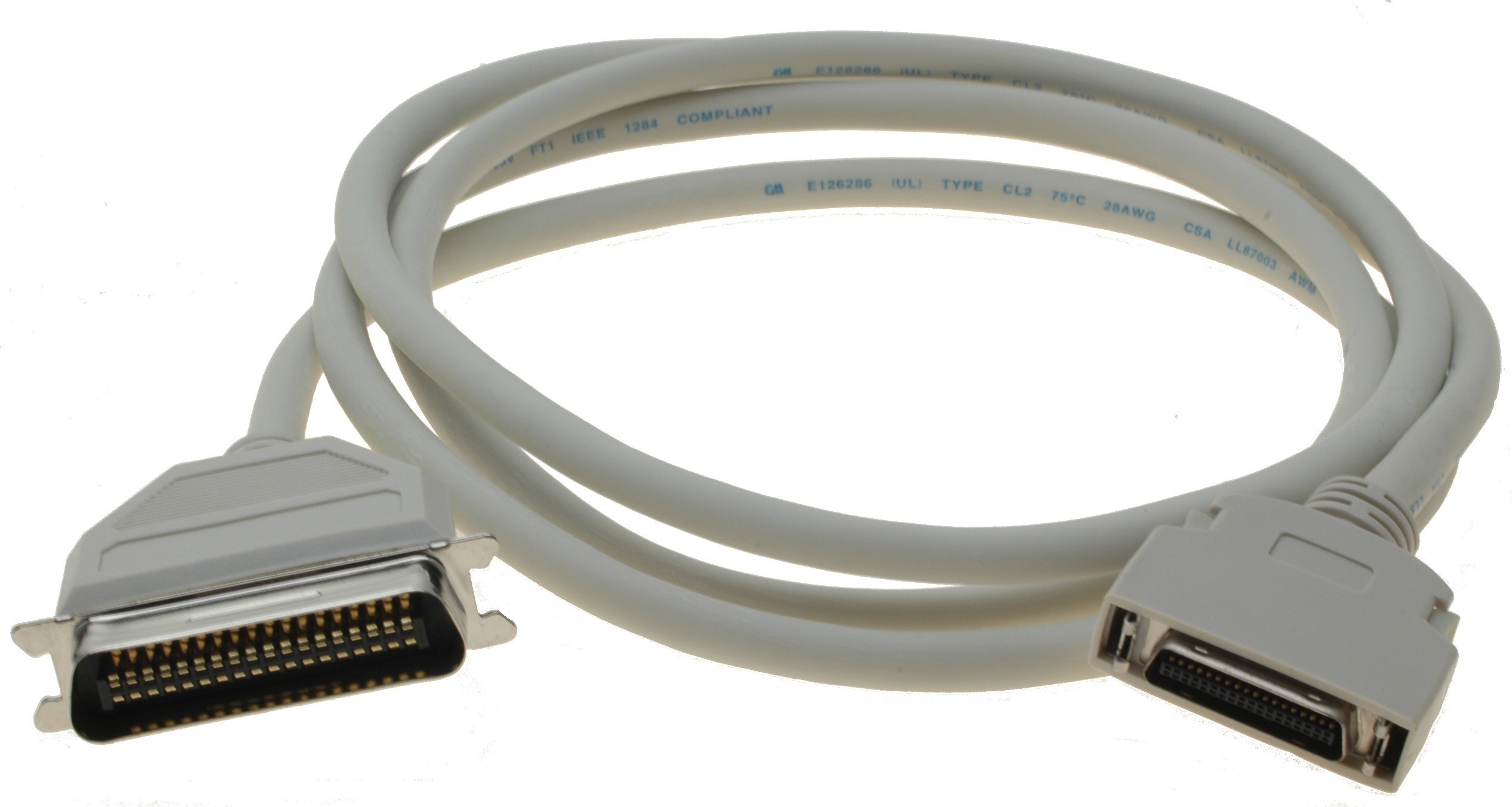 Connects any device with minicentronics36 male to centronics36 male. Supports all IEEE1284, Bi-tronics and centronics devices. This premium cable has double shielding and is fully-wired with 18 Twisted Pairs to support EPP/ECP's maximum speed. This cable has matched impedance, PVC jacket, molded ends with thumbscrews and inner hood soldered 360 degrees to the connector for complete end to end shielding