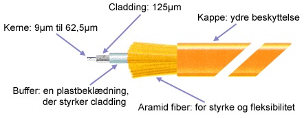 - 9/125 betyder at kernen er 9µm og claddingen er 125µm tyk. Singlemode kabel type OS1
