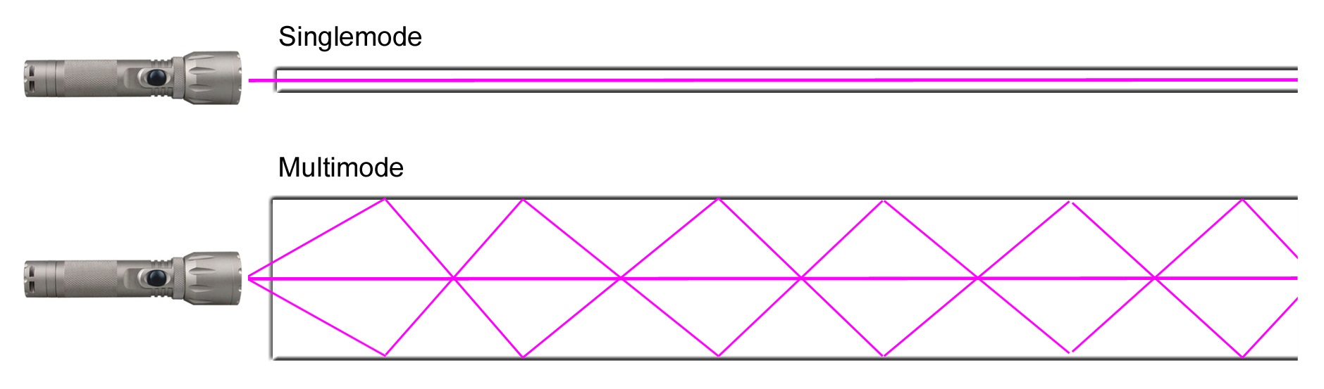 I Single Mode sendes lyset direkte som en stråle, hvorfor rækkevidden er større.