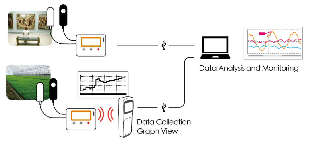 Du skal blot placere LOG-74UI på målestedet efter start af optagelsen. Registrerede data kan derefter downloades ved at forbinde loggeren til en PC med et USB-kabel og bruge vores Windows-software “Illuminance UV Recorder for Windows”. Data, der downloades til din PC, kan derefter ses og analyseres med vores Windows-kompatible software “TD Graph”. Ved at forbinde en logger til din PC er det også muligt at overvåge aktuelle aflæsninger ved hjælp af vores Windows-software.