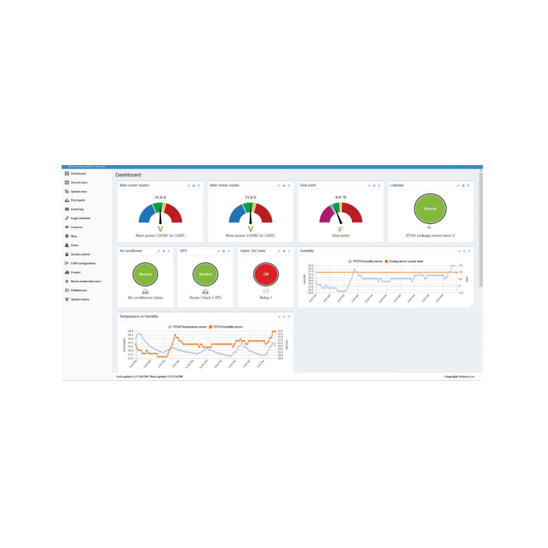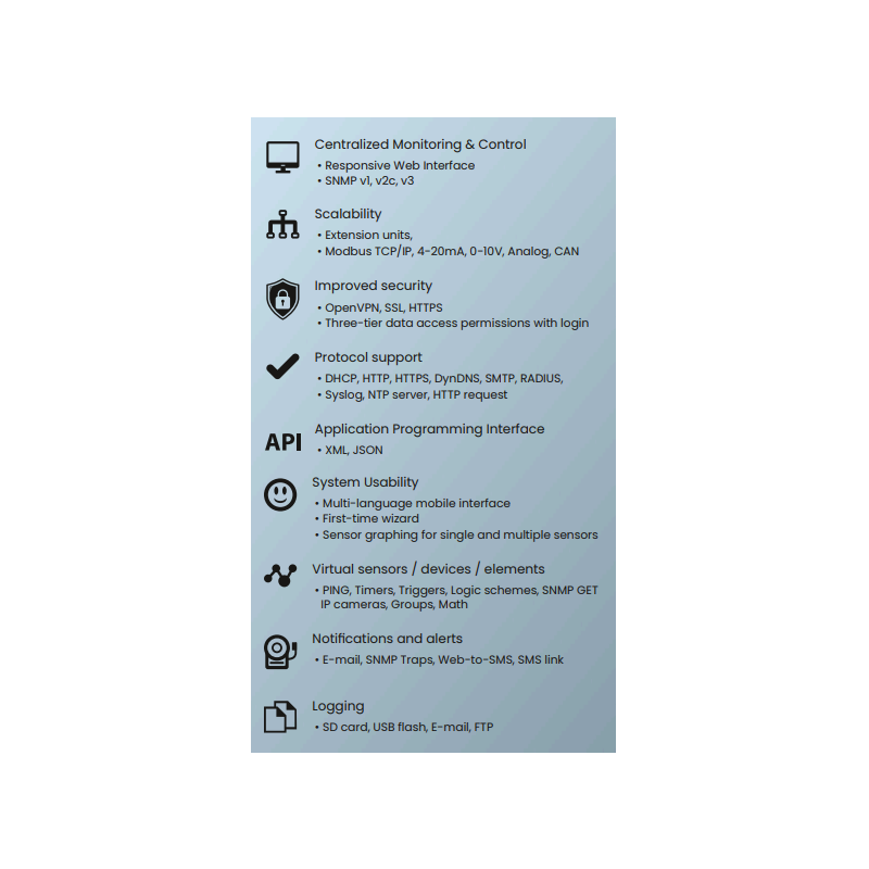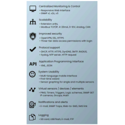 Kan overvåge op til 100 fysiske sensorer. Kan bruge op til 700 forskellige elementer - meddelelser, triggere, timere, logiske skemaer, sensorer og tørre kontakter.