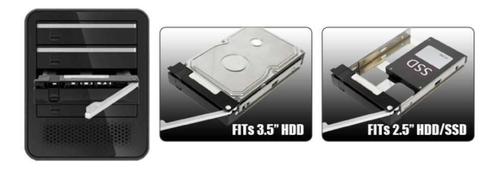 Harddisk skuffe til 2 x 2½ "SATA SSD / HDD fylder som 5 1/4 enhed. Så diskene kan udskiftes enkelt HOT SWAP