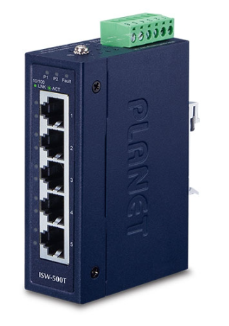 5 port 100Mbit unmanaged kompakt switch med DIN-beslag. 12 - 48VDC eller 24VAC. -40 - +75°C