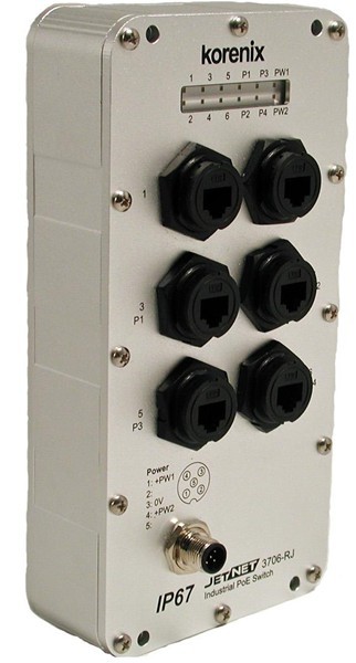 Industriel switch til Ethernet med 6 porte. Med ESW6-IP67 følger specielle vandtætte kapper, der monteres ud over RJ45 stikkene og gør dem vandtætte. Kapperne skal monteres på kabel inden for RJ45 stikkene.