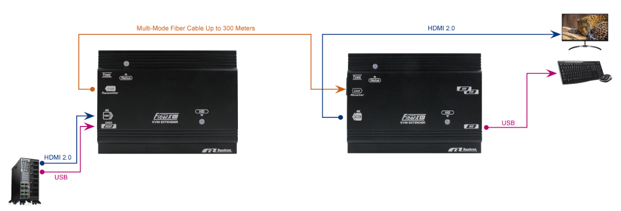 KVM Extender over Fiber består af en sender og en modtagerenhed, der giver dig mulighed for at udvide HDMI 2.0 og USB HID-signaler op til 300 meter over LC Multi Mode fiberoptisk kabling. Den understøtter de fleste af de populære Windows, Mac, Sun, Chrome O.S og Linux operativsystemer.