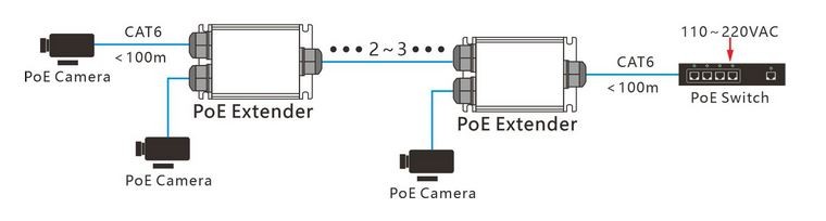 Extenders får strøm fra PoE og sender PoE videre til den næste Extender