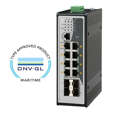 8 ports DNV GL marinegodkendt Managed switch 8 x 10/100/1000Mbit. Fiber 4 x 1000Mbit SFP slot, 12 - 60VDC, DIN -40 - +75°C