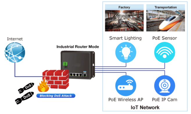 ETH-ROUTER-4POE+U kan fungere som en alt-i-en router i en industriel applikation for et firma, der har en fabrik og mange forskellige afdelinger. ETH-ROUTER-4POE+U kan levere op til 4 PoE+, in-line strømgrænseflader, centralt styring af strømforsyning til fabrikken, hvor PoE IP-kameraer og PoE-sensorer er bygget. Det giver også dataforbindelse til kontordokumentation. På samme tid kan ETH-ROUTER-4POE+ adskille brugere og IoT-enheder med VLAN for at have god ydelse. Med firewall-beskyttelse forhindrer det IoT-netværket i trusler, hvilket gør industrielt netværk mere sikkert.