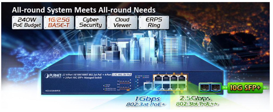 Kraftig og meget alsidig PoE+/++ Gigabit switch med 3 x VLAN Static Routing og PoE-applikation.