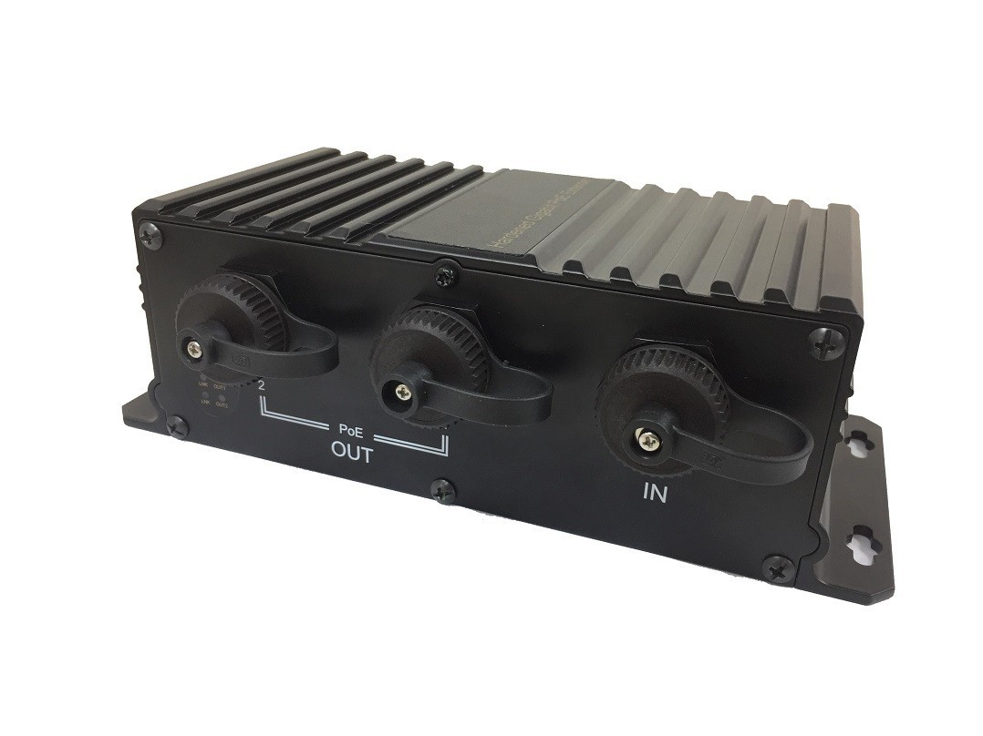 PoE Splitter / PoE Extender. 1 x PoE++ ind og 2 x PoE+ ud til 2 PoE PD enheder, 30 Watt hver. IP67 og IK10 vandalsikker