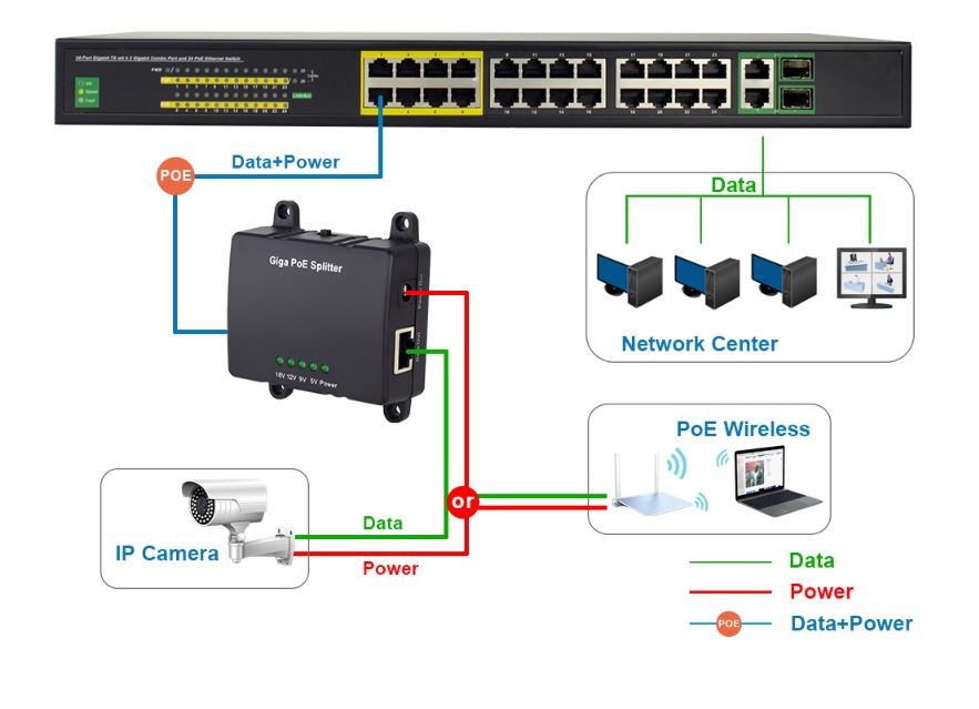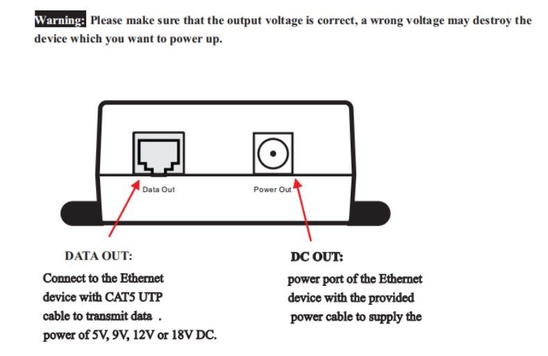 PoE splitter med spændingsvælger til 5, 9.12.18 Volt