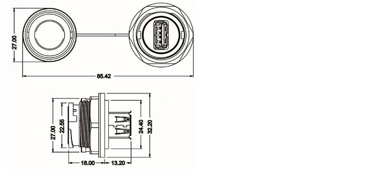 Vandtæt USB3.0 A-hun og A-hun stik til chassis, IP68 tæt med hætte påsat. Ingen modpart