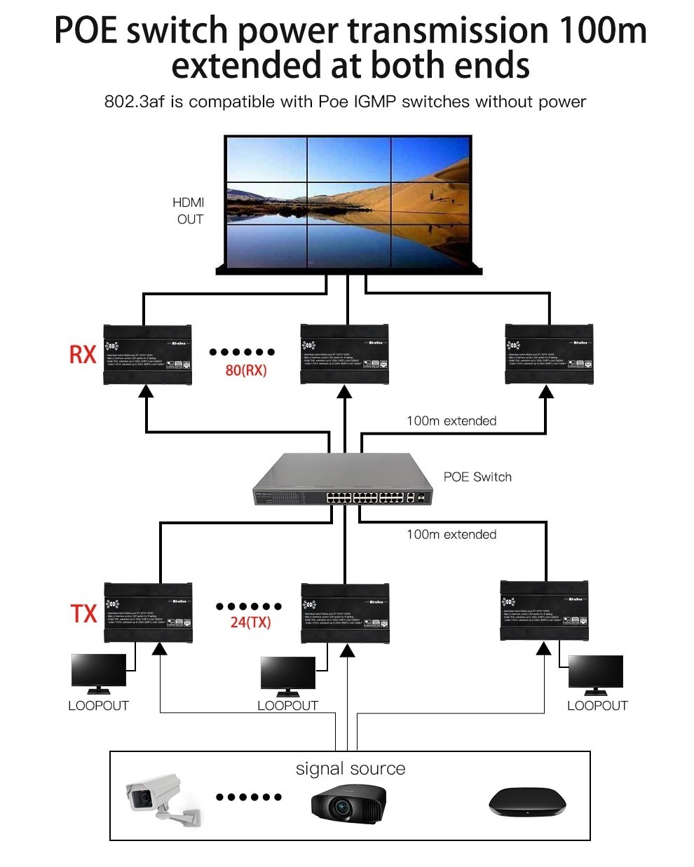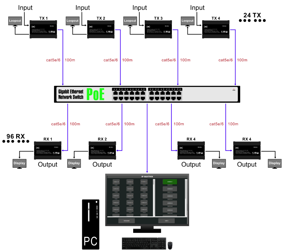HDMI-MATRIX24X96-IP kan f.eks. tilsluttes en 48 port PoE switch (med IGMP eler IFMP Snooping). Så bestemmer du selv hvor mange indgange og udgange du vil have. På denne måde opnår du længere rækkevidde, da et netværkskabel kan kører 100 meter.