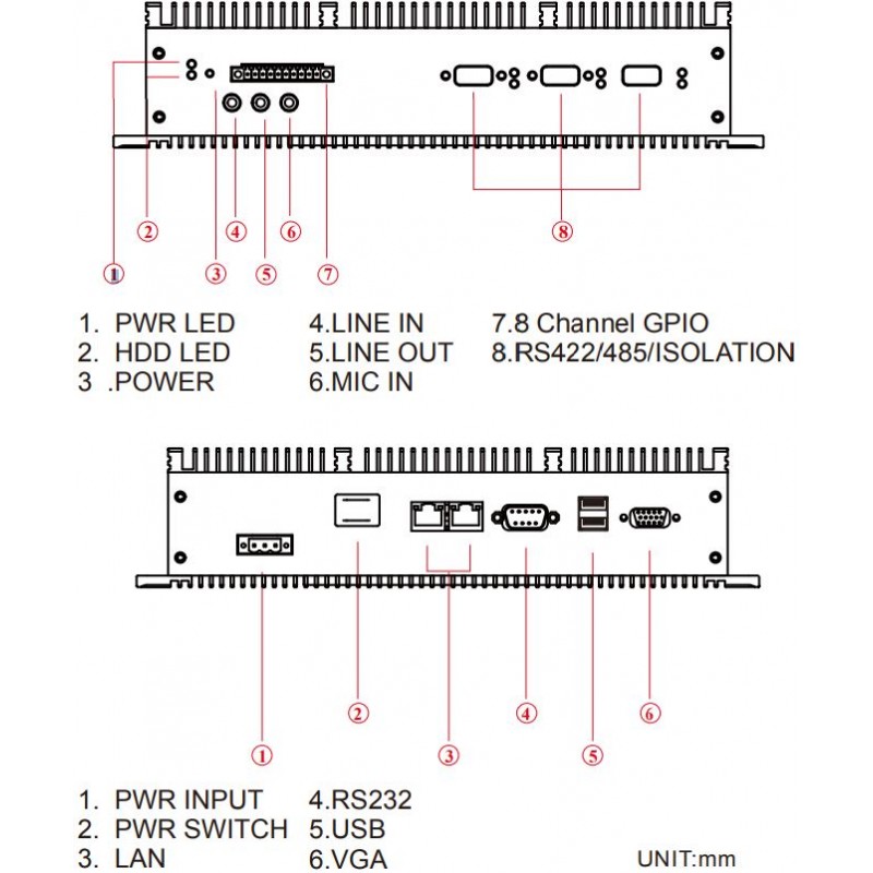 2x Giga LAN, 2x USB, 1x VGA, 1x Line in, Line out, Micro I