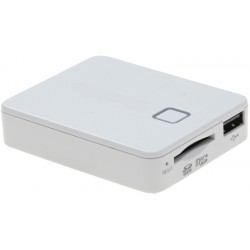 FLASH-WIFI-BATT is a wireless multi-functional device that has a card reader, battery for smartphones and wireless bridge. The wireless card reader only works with the smartphone app, whereas the bridge function works with all devices that can access a wireless network. However, the card reader can also be used with a USB cable. The bridge function is ideal when using multiple devices on a new wireless network. It is only necessary to configure the FLASH-WIFI-BATT and then all devices can connect to its WiFi network.