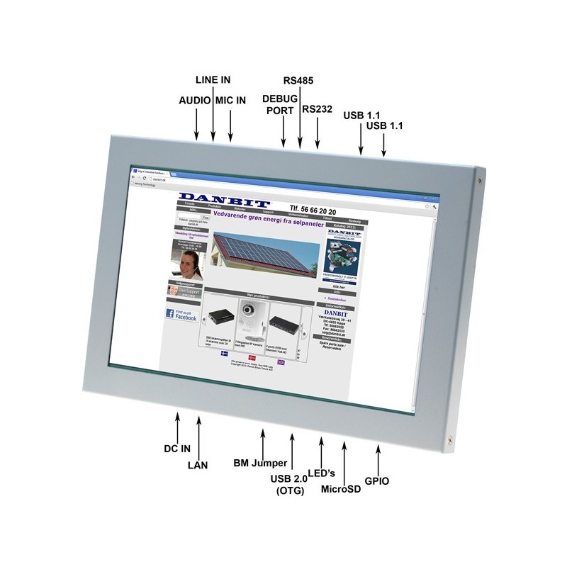 Skærm 10,1” TFT LCD, 200 cd/m2. Maks. opløsning 1024 x 600 punkter. Touch Resistive 4 wire