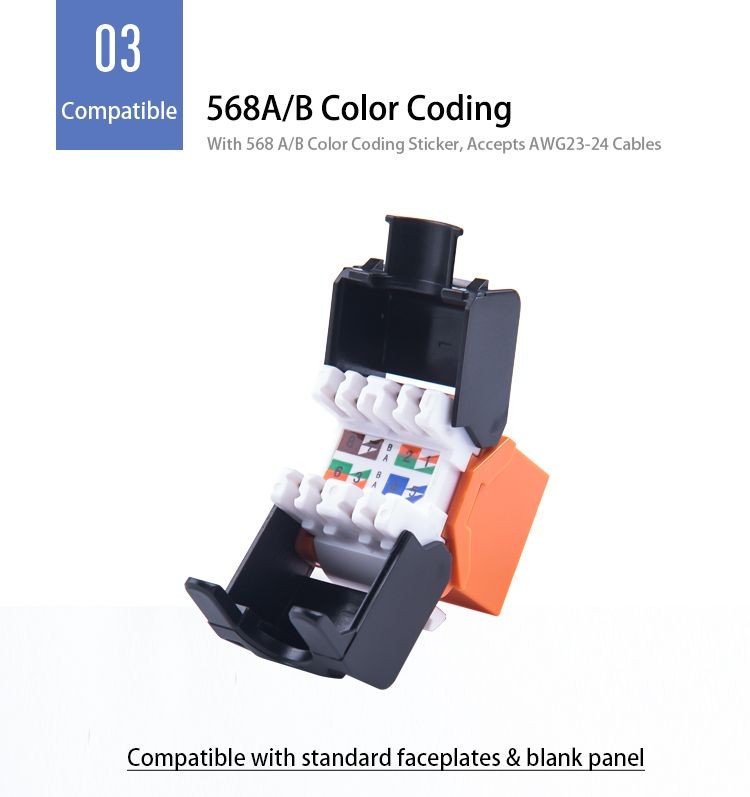 Keystone jack RJ45 female connector, plastic. Installed without the use of crimp pliers