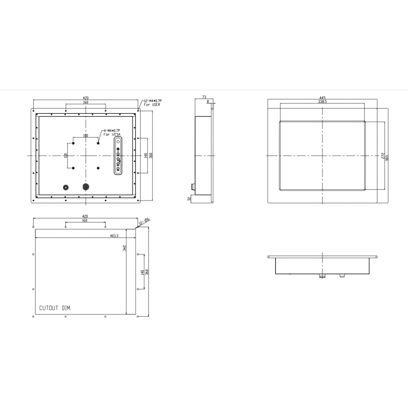 15" Industrial Screen, 6-sided IP65 sealed in stainless steel cabinet, touch, VGA, 4:3 format, 9-36VDC